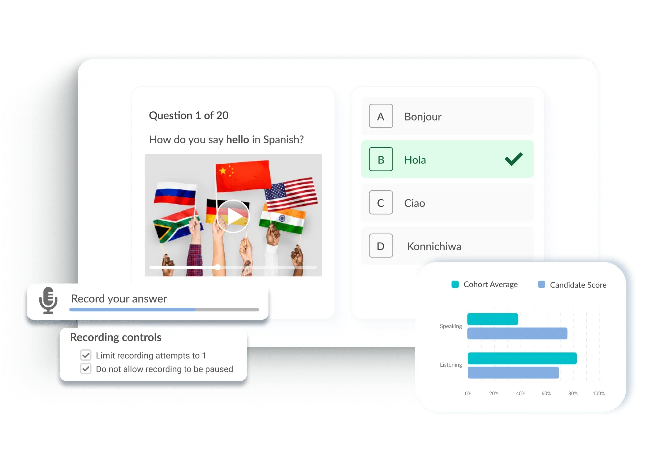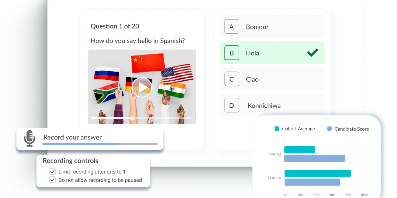 Our advanced audio and video controls ensure accurate evaluation of speaking and listening proficiency.